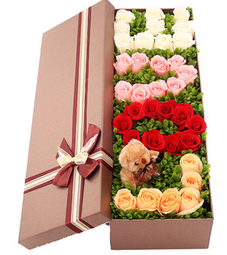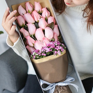 • 【19枝紅玫瑰,綠葉、滿天星 】 + 【德芙鐵盒心形巧克力(98克)】