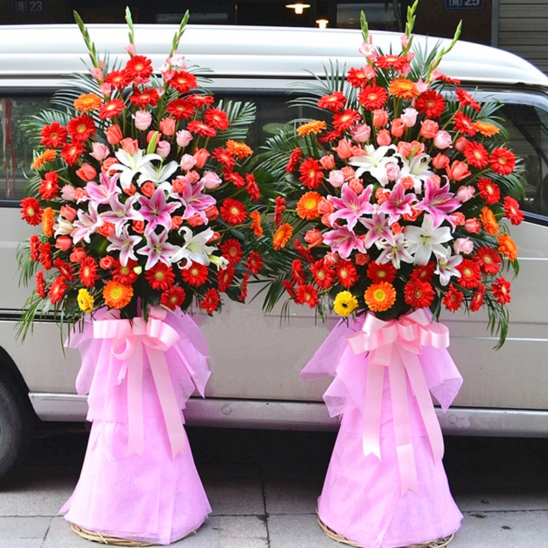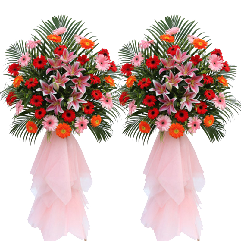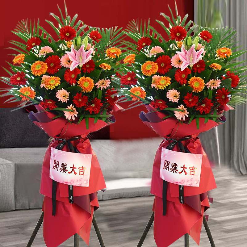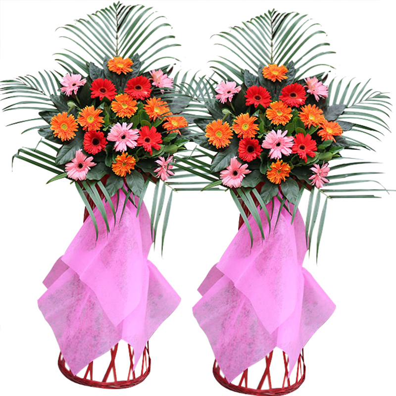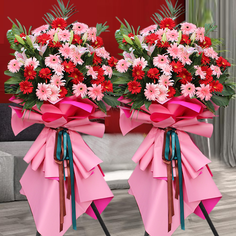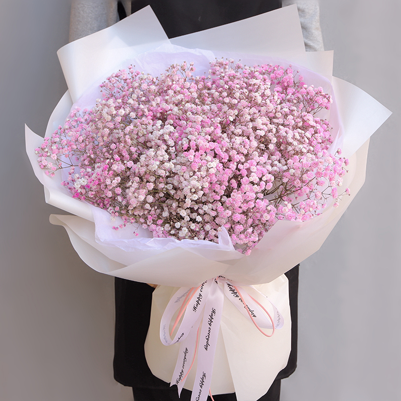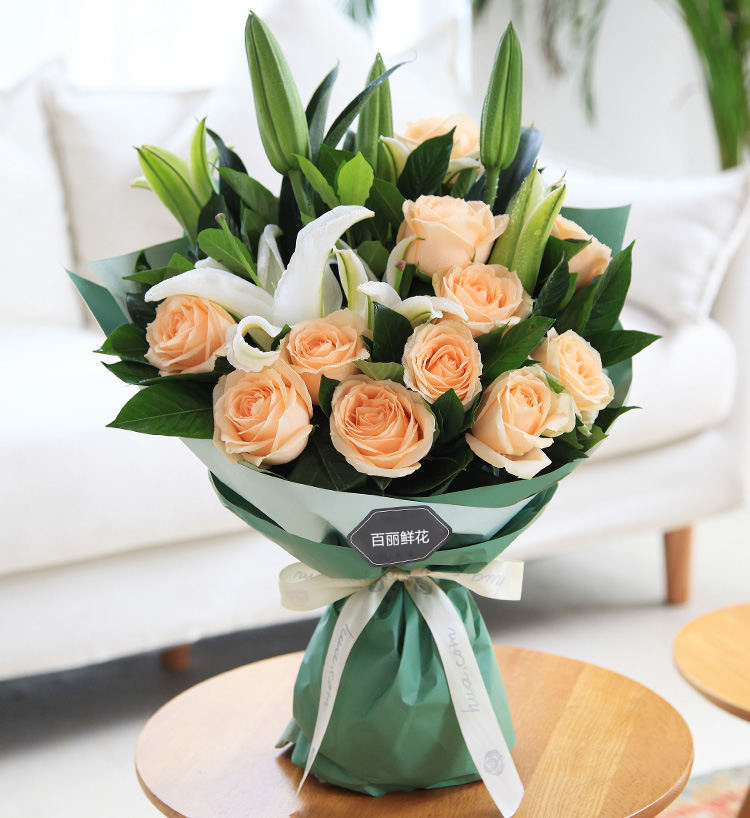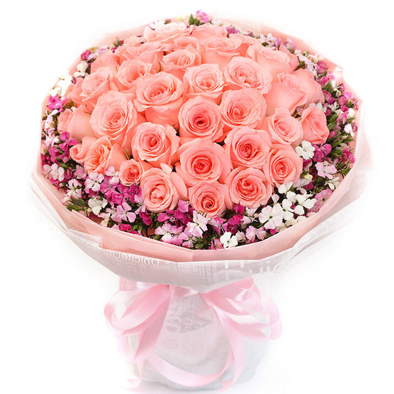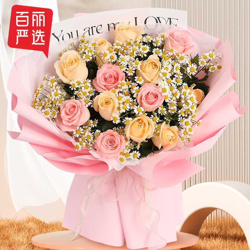 • 【19枝粉色扶郎,白色小菊間插,梔子葉間插】+【8寸鮮奶水果蛋糕】